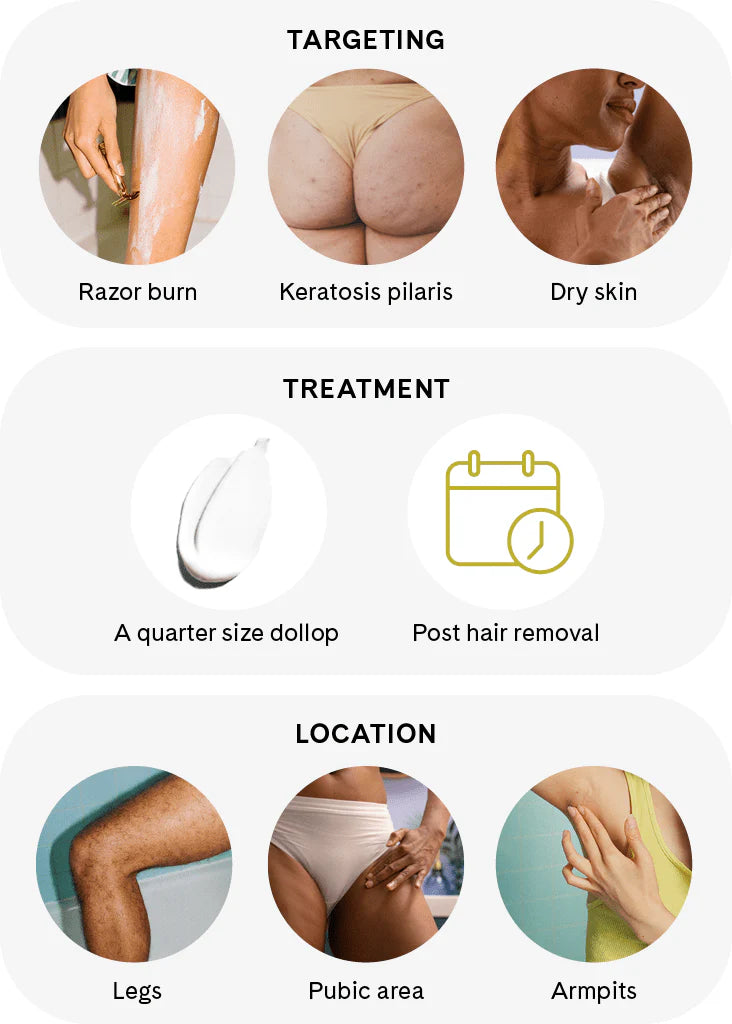 All over body moisturizer maintains smoothness. Lightweight and fast-absorbing, this 100% natural formula is ideal for daily use to prevent ingrowns, bumps, and razor burn. Used as an aftershave it softens prickly stubble and keeps skin smooth in areas where hair has been removed completely.